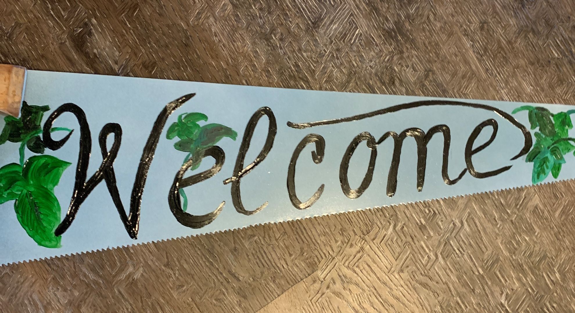 Hand painted saw blade. "WELCOME" with ivy leaves. Saw dimensions are based on average hand saw.
